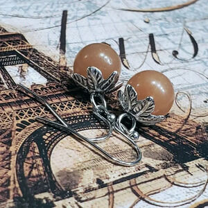Each handcrafted gemstone earring features a single round stone bead dangle topped with 6-petal carved antique silver platinum plated leaf bead cap. Platinum plated brass French hook earwires.