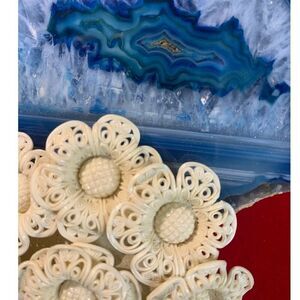 Design is layered flowers with lace-like edges and checkerboard centers