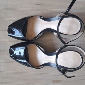 glam chic, modern elegance, sophisticated style, timeless black heels, evening wear, cocktail party, formal event, patent leather shine, wedge heel comfort, dressy casual, city chic, polished look, fashion-forward, versatile style, wedding guest, holiday party, special occasion shoes, classic silhouette, wardrobe essential, statement heels, romantic style, sleek and glossy, feminine charm, elevated basics, resort evening, dinner date style, feminine, chic, elegant, classy, minimalistic, stylish, fashionable, youthful, simple.