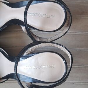 Arturo Chiang Black Patent Leather Peep Toe Ankle Strap Wedge Heels