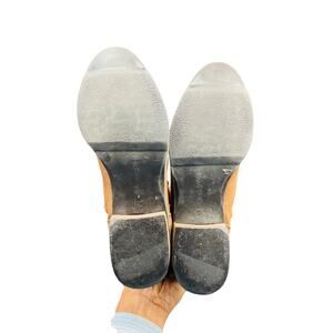Arturo Chiang genuine leather tall boots, size 7M. Features multiple buckle strap details, side zipper, and stacked low heel. Rich caramel brown leather with vintage-style finish. Perfect for boho, equestrian-inspired looks, fall and winter outfits, or festival wear. Pre-owned in very good condition with normal wear on soles.