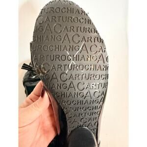 Chic black patent leather moccasin flats by Arturo Chiang.