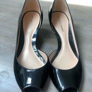 Arturo Chiang black, patten leather peep toe shoes with cork, wedge heels.