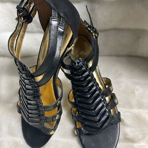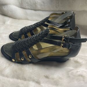 Arturo Chiang Leather black ankle straps wedge sandals gold tone studs accents size 10M pre owned in good used condition normal wear.E1