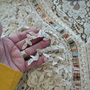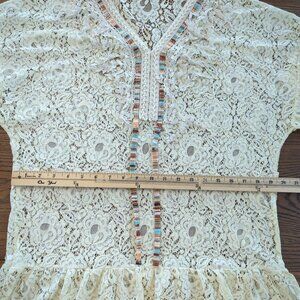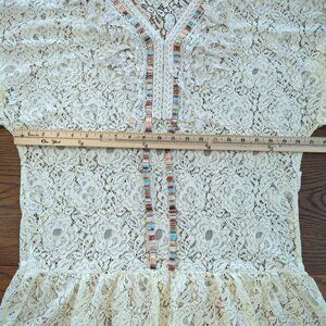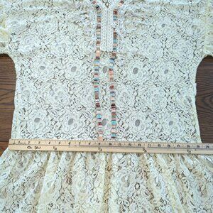 This Bohemian cream lace tunic dress features intricate floral patterns and a colorful beaded V-neckline. Lightweight and breathable, it is perfect for warm weather or layering. The flowy sleeves and gathered hem add a touch of feminine charm for versatile styling options.