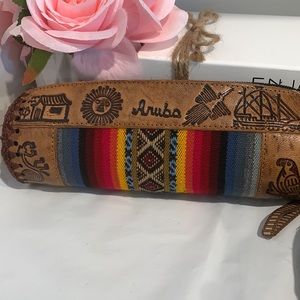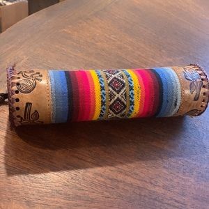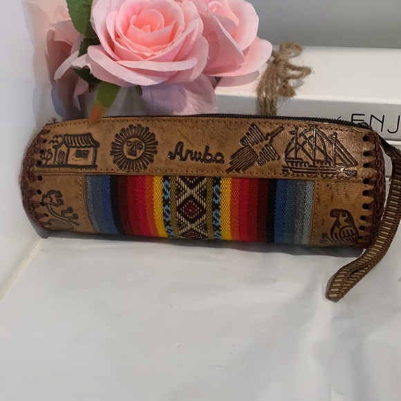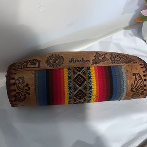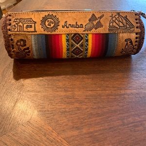 Hand Carved Pencil Case/Peruvian Manta Pencil Case/Pencil pouch/ Leather zipper pouch