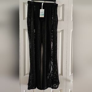 Aruba Blue Women's BlackTropical Patterned Crochet Pull-on drawstring waist Wide leg Beach Pant Swim Coverup Size Small