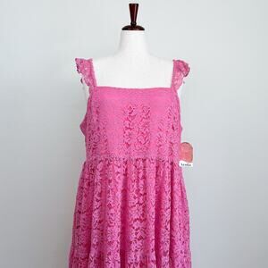 NWT Size 3X Arula Dress. Stretchy shoulder straps with ruffles. Pink lace overlay fabric. Square neckline. Back panel has shirring for stretch. Lined. Blogger image used to show fit. So romantic and pretty!