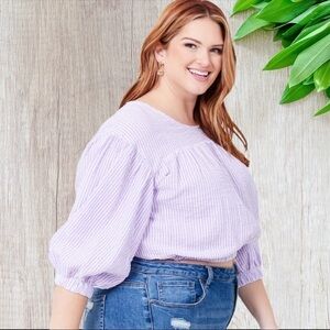 Arula, plus size crop top, spring blouse, cottagecore light, romantic casual, soft textures, feminine stripes, boho soft, coastal granddaughter, balloon sleeve blouse, lightweight layering, weekend wear