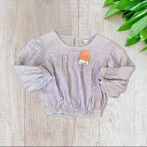 This cropped blouse has a lively lavender striped print with a fun elastic hem and sleeves! the puff style creates a comfortable and breathable flowy fit. perfectly paired with white denim, this look with have you ready for spring.