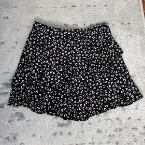 floral print, ruffled hem, midi length, high waist, flowy, boho style, black and white, lightweight, layered, feminine