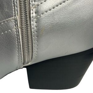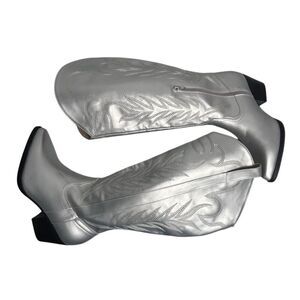 The Arula Western boots in size 9 feature a knee-high shaft and a chunky mid-heel, perfect for casual occasions. Made from silver vegan leather with an embroidered pattern, these boots have a pointed toe and a pull-on closure. The lining, insole, and outsole are all crafted from synthetic materials. Manufactured in China, these boots are pre-owned and in excellent condition with minor scratches. Keywords: Arula, Western boots, size 9, silver, vegan leather, knee-high, chunky heel, embroidered, pointed toe, casual, pre-owned.