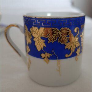 There are three sets of cups and saucers with a royal blue band that has gold leaves and grapes/vines over that, and a white background. All the cups are handled and remind me of Sake cups, but probably just demitasse tea cups, as I am not sure if Sake cups usually have handles.