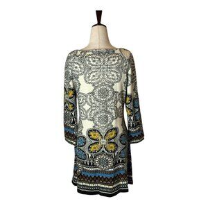 designer, knit, casual, colorful, geo, geometric, winter, spring, fall, classic, weekend, vacation, chic, stretch, Knit, stylish, trendy, LS, long sleeve, urban, mod, modern, Long Sleeve, pullover, boat neck, bateau neck, mini, Mini, Short, Casual, stretch, comfort, comfortable, loungewear, Stretchy, Soft, elegant, sophisticated, professional, business, workwear, travel, vacation, Size 8, Size 10, M, Medium, Fit & Flare, Fit N Flare, Fit And Flare, Tunic, Anthro, anthro,