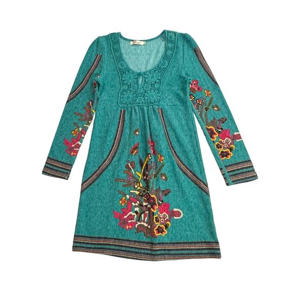 Aryeh Womens Sweater Dress Medium (XS) Teal Green Floral Butterflies Boho Lace