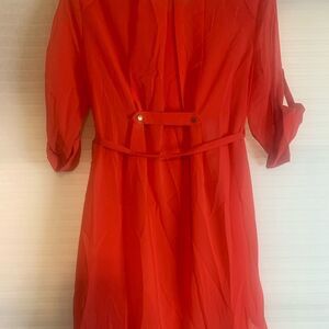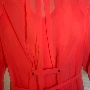 Aryn K Pea In The Pod Maternity Semi Sheer Coral Pink Tunic with belt. Silver buttons up the front.