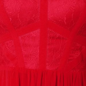 Add a ravishing glow to that evening affair in the Aryn K Fire Dancer Strapless Red Maxi Dress! A lightly padded bustier bodice is overlaid in scarlet lace, while maxi-length chiffon gathers in along a fitted waist and opens into a sultry 29" slit along the left side. Invisible back zipper/hook clasp. Dress is lined to mid-thigh