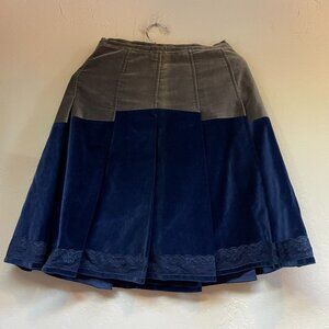 Gorgeous velvet skirt designed with button-down front, pleated, and lace detail at hemline.