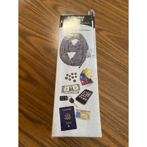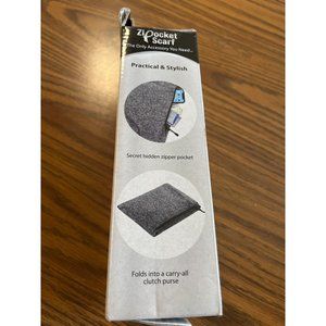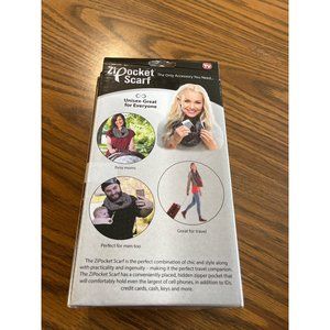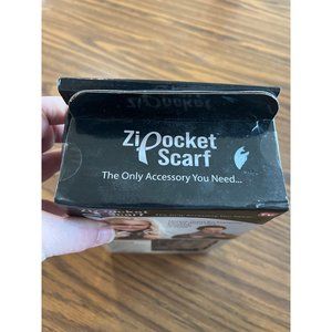 As Seen On TV ZiPocket scarf. New in box. 56”x15”. Secret hidden zipper pocket. Folds into a carry-all clutch purse. Unisex. Great for travel. Infinity loop can be worn tied, knotted, wrapped or loose. The only accessory you need! Machine washable.