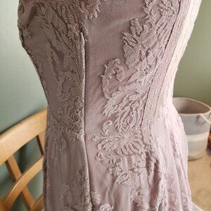Deep "V" mini dress with a sheer mesh overlay featuring a beautiful embroidered design with scalloped trim. Hidden side zip. Lined.