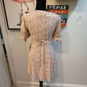 This charming mini dress by As U Wish is designed for both casual outings and wedding guest occasions. It features a flattering fit and flare silhouette with a delicate cream and pink floral pattern. The v-neckline and flutter sleeves add a touch of elegance to this versatile piece.