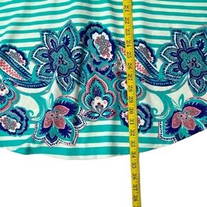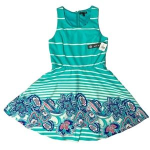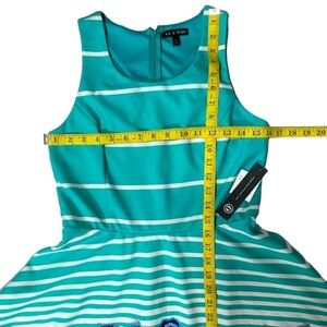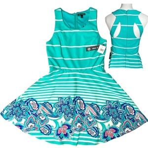 As U Wish Skater Flare Dress Cut Out Back Sleeveless Nautical Teal and White Stripe with Floral Boarder Junior Large