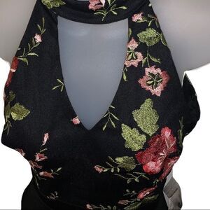 Gorgeous embroidered torso with black skirt Keyhole neckline As U Wish brand Brand New size XS Measurements - 32" from neck to hem 16" from armpit to armpit floral, keyhole, cutout, summer, cocktail