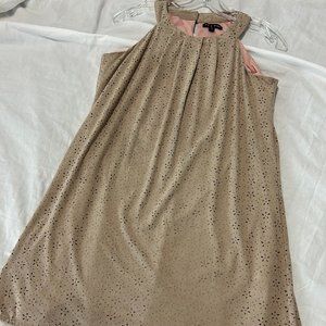 As U Wish Faux Suede Mini Dress. Tan. Laser Cut Floral Design. Excellent Used Condition - one small flaw at back near button closure - see photo. Fully lined in pink. Laying flat measures approximately 16" pit to pit, 31" shoulder to hem.