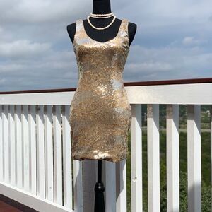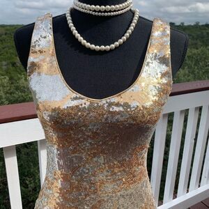 Gorgeous holiday party dress pullover gold and silver sequin v neckline front and back fully lined (minor sequins pull in the back) otherwise in great preloved condition smoke/pet free