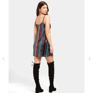 Gorgeous mini dress with vertical rainbow stripes illustrated with sequins. Sparkly and fun, perfect for a holiday party or a night out with friends.