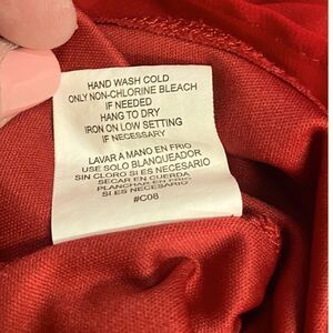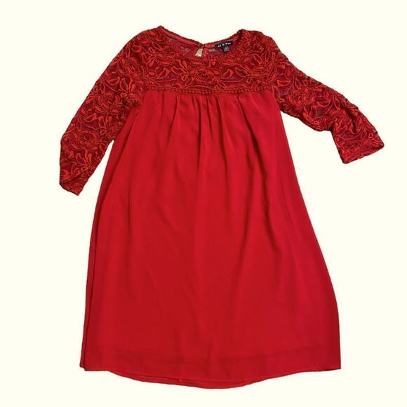 Fully lined red dress is loose fitting with lace top and lace sleeves. Dress is 100% polyester and is size small. Excellent condition.