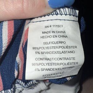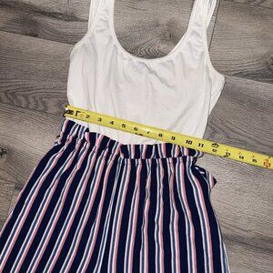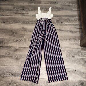 The As U Wish Red White and Blue Jumpsuit in XS size is a sleeveless, striped patterned one-piece outfit made from a spandex and polyester blend fabric. It features a wide-leg style with an elastic waist and belted accents, making it suitable for various occasions such as travel, weddings, parties, casual wear, workwear, and business meetings. The jumpsuit has a classic fit and is machine washable for easy care, making it a versatile and stylish choice for women looking for a comfortable and chic outfit.