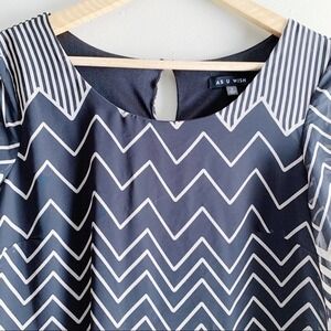 Gray & Cream chevron dress by As U Wish, featuring a flowy swing shift silhouette, lightweight semi-sheer overlay, full lining, short sleeves with rolled trim and button loop closure, scoop neck, back keyhole with button loop closure, above-knee length.