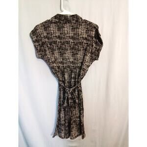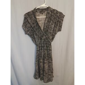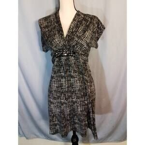 As U Wish black dress with reflective rivet style buttons at waist, crossed V neck.