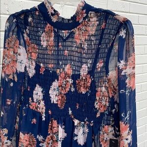 Sheer dress with navy slip dress built in. NWT. Dress is long sleeves and is gathered over bust area. There is a tie at neck on back. Would be cute with leggings and boots!