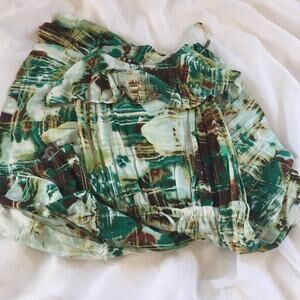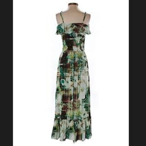 Maxi sundress by As You Wish. Size small features waist tie, ruffled bust and hem in a brown and green abstract pattern. Fabric is 100% rayon. Bust 32", waist 26" (but easily stretches), length 52" with straps adjusted halfway. Comes to my ankles and I am 5’4”
