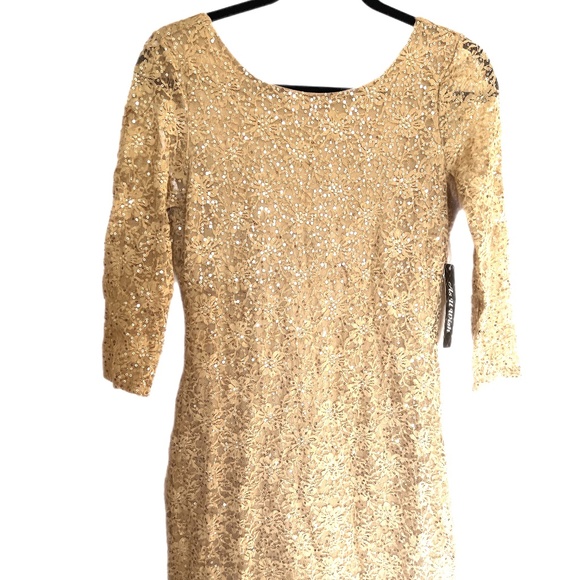 As You Wish NWT Women's Cocktail Dress Lined, Gold Sequin ,Body con, 3/4 Sleeve, Backless Pullover SZ M