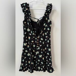 Floral print dress from Free People with a femme + flirty style. Structured look with a wide v-neckline and topped with flowy cap sleeves. Cut with a swingy mini length hem.