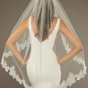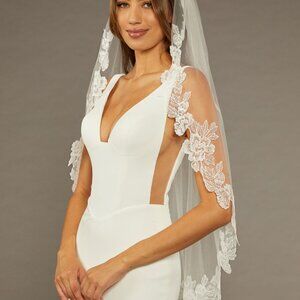This stunning bridal veil exudes elegance and romance with its beautifully detailed floral lace appliqué along the edges. The soft tulle drapes gracefully, creating a dreamy, ethereal effect that enhances any wedding look. The lace motifs frame the face and shoulders, adding a touch of vintage charm while maintaining a modern sophistication. Designed to complement a variety of bridal styles, this mid-length veil is perfect for brides looking for a statement accessory that is both timeless and effortlessly chic.