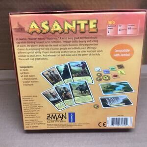 This is the popular, fast-paced two-player strategy card game Asante published by Z-Man Games! Asante is a stand-alone game set in the world of Jambo, focusing on trade, strategy, and earning the most gold.