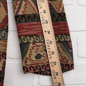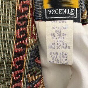Vintage Ascente Sport blazer in size medium. Featuring a vibrant Aztec Southwestern USA tapestry pattern in a colorful palette of red, green, pink, tan, blue, black, rust, gold, and brown. Made of a comfortable cotton poly blend.