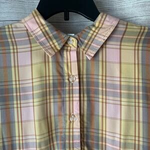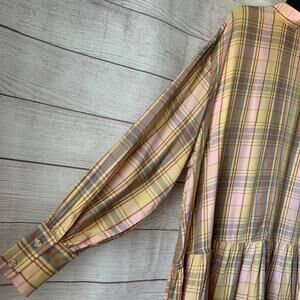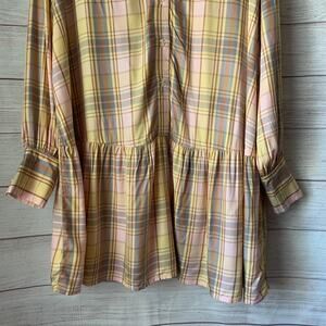 Ascot and Hart Yellow Pink Plaid Dress Button Up Front Collar Long Sleeves Large
