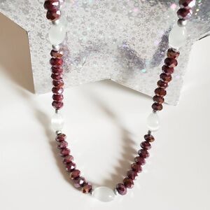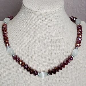 5mm wine color faceted glass beads, 14mm clear frosted glass beads and silver plated spacers and closure were used to create this necklace. It is 19 1/2 inches long.