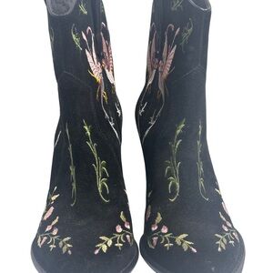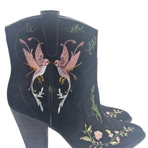 Elegant black heeled boots with floral embroidery. Perfect for adding flair to any outfit.