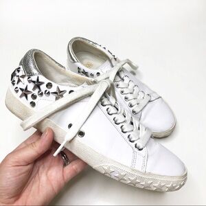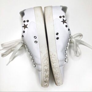 White leather uppers, silver star stud detail. Shimmery silver heel. Lace up sneakers.