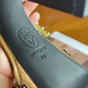 Elegant platform heels with a striking snake pattern. Features gold accents and Ash branding.