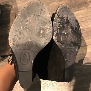 4.5" self-covered wedge heel. Suede upper. Fringe detail. Peep Toe. Back zip closure. Leather lining and sole. Lightly padded insole. Excellent condition. Worn only 2 times.