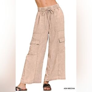 These ash mocha wide-leg cargo pants are neutral, breathable, and effortlessly cool. Made with a soft linen-blend fabric, they feature a flattering high-rise elastic waistband, drawstring tie, and oversized side pockets โ giving you utility with a luxe lounge feel.