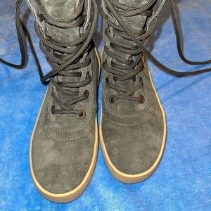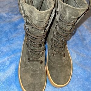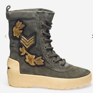 These lace-up khaki suede boots are covered in military badges and feature a practical rubber sole