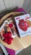 Red mini waffle maker with gingerbread design. Includes red measuring spoons and cookie cutters. Perfect for festive cooking.